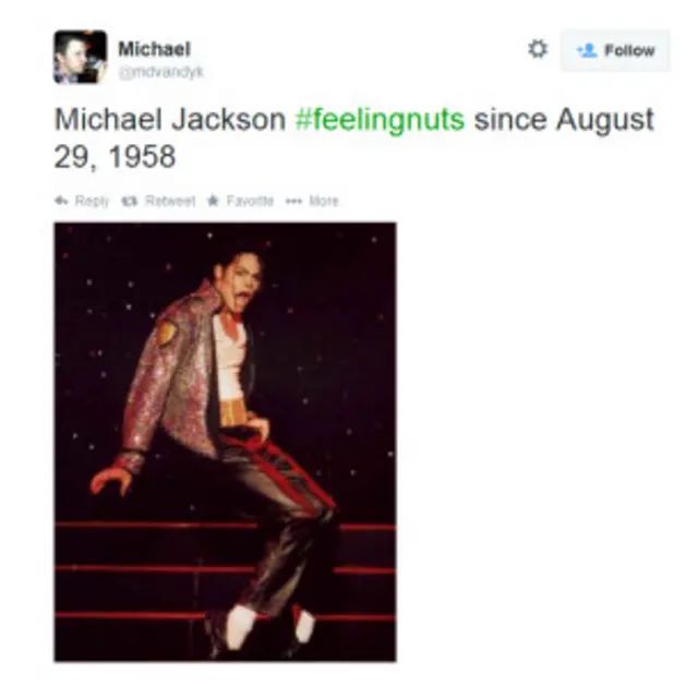 "Майкл Джексон #feelingnuts с 29 августа 1958 года", - <link type="page"><caption> написал</caption><url href="https://twitter.com/mdvandyk/status/517287424809254913/photo/1" platform="highweb"/></link> в "Твиттере" юзер @mdvandyk, намекая на фирменную танцевальную позу Майкла Джексона.