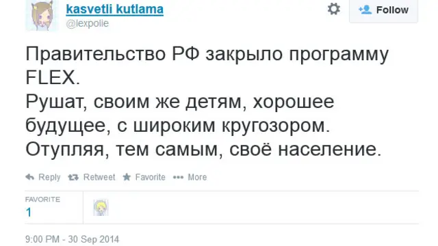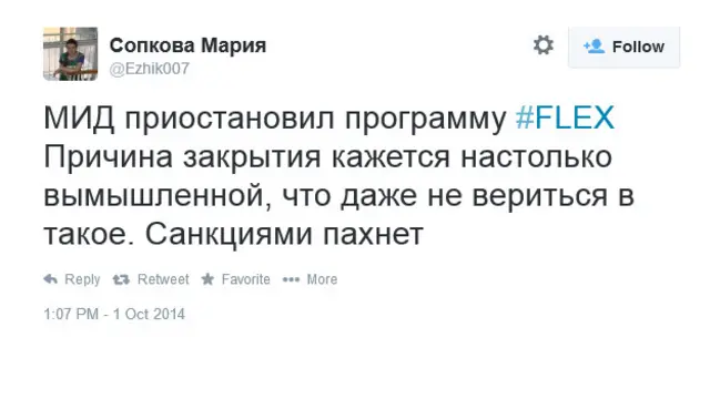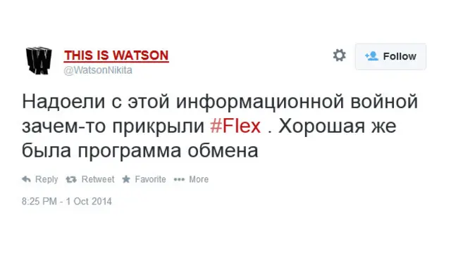 "Жизнь- боль. Когда у тебя последний год участия во FLEX, а эту программу упраздняют на два года", - <link type="page"><caption> пишет @_Russian__Guy.</caption><url href="https://twitter.com/_Russian__Guy_/status/517312267449536512" platform="highweb"/></link>
