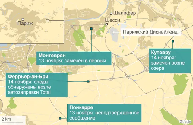 Охота началась неподалеку от парижского Диснейленда после того, как местный житель поднял тревогу, заметив крупное животное, напоминавшее тигра, возле заправочной станции на шоссе.