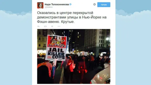 "В Нью-Йорке перекрыли мосты, в Лос-Анджелесе - автостраду -#Ferguson - люди вышли за кремлевские печеньки!" -<link type="page"><caption> шутит</caption><url href="https://twitter.com/NostroGatto/status/537157503705165824" platform="highweb"/></link> пользователь с говорящим ником КотНаш.