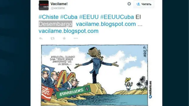 <italic>(<link type="page"><caption> рисует картину</caption><url href="https://twitter.com/vacilame/status/545516776352927744" platform="highweb"/></link> "Снятие эмбарго" эквадорский сатирический интернет-журнал Vacilame. Chiste по-испански "шутка")</italic>