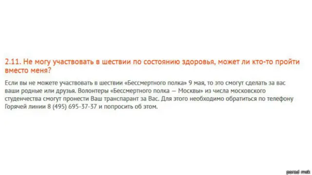 На <link type="page"><caption> сайте, посвященном акции памяти</caption><url href="http://parad-msk.ru" platform="highweb"/></link> в Москве, в разделе "вопросы и ответы" говорится, что если кто-то не может принять участие в акции по состоянию здоровья, за него плакат может понести другой человек.