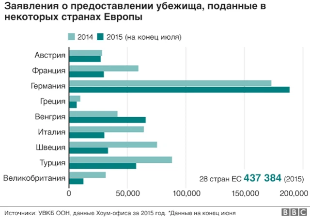 Европа в этом году столкнулась с небывалым потоком беженцев. На конец июля 438 тысяч человек подали прошение о предоставлении убежища в странах Европы. Для сравнения, за весь прошлый год была подана 571 тысяча заявлений.