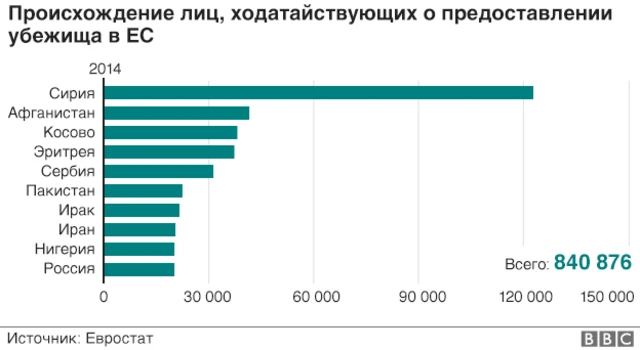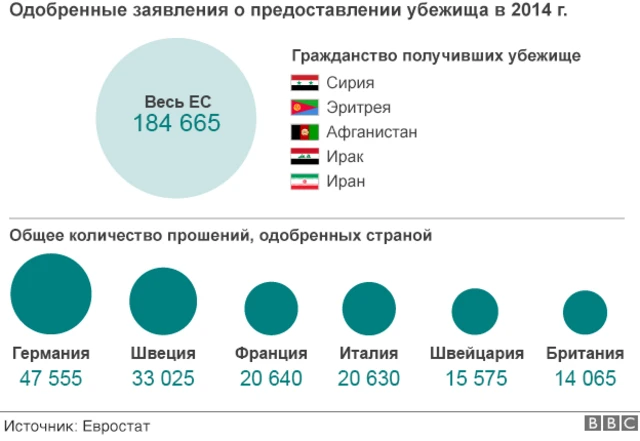 Всего в 2014 году 570 тысяч человек подали прошение о предоставление им убежища. Надо иметь в виду, однако, что процесс рассмотрения прошения может занимать несколько лет, поэтому люди, которым было предоставлено убежище в прошлом году, могли подать прошение раньше.