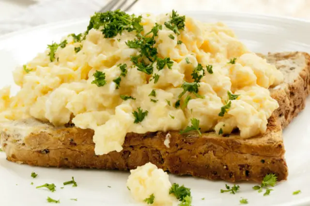 Яичница-болтунья (можно с хлебом из цельнозерновой муки)