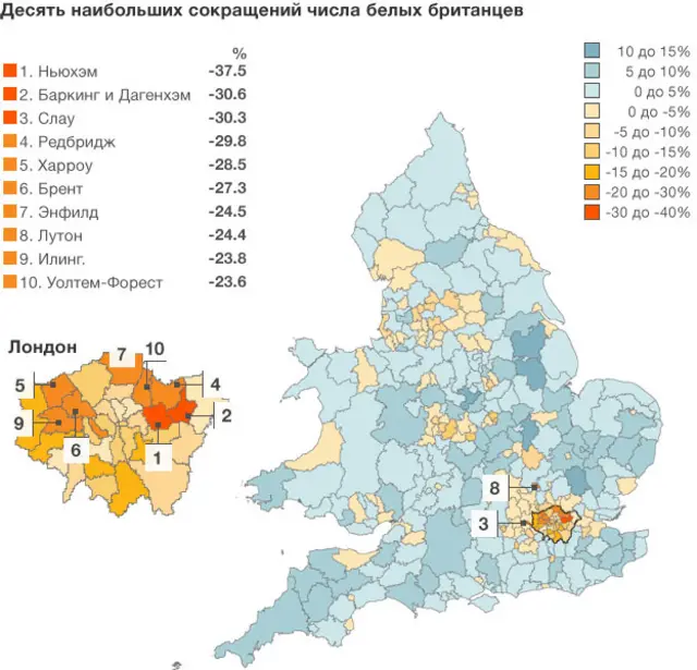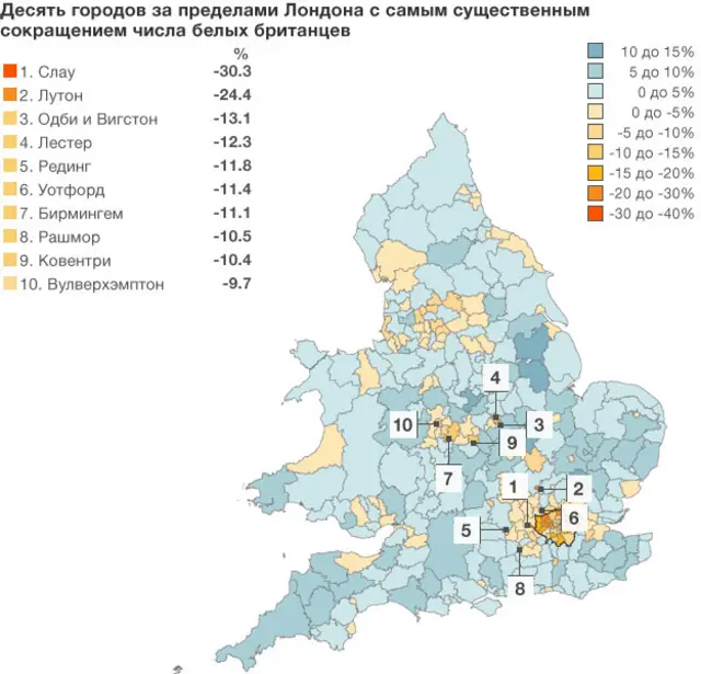 Более десятка населенных пунктов и районов с наибольшим приростом численности белых британцев находятся на востоке Англии.