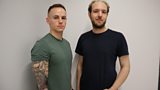 Photographer Charlie Clift and Lance Corporal Josh Pickman look at military tattoos.