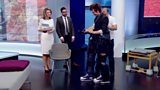 A paralysed man demonstrates the robot which has enabled him to walk again.