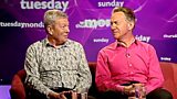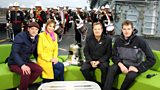 Matt Baker, Alex Jones and comedian Eddie Izzard are on the flight deck of HMS Illustrious