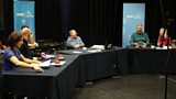Aled Hall yn ceisio cadw trefn ar ddau dîm mewn brwydr eiriol. Gem banel i godi gwên.(A)
