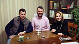 Nia Roberts gyda dau sydd â rhywbeth yn gyffredin – heddiw Tudur Owen a Nigel Owens.