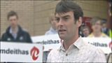Cadeirydd newydd Cymdeithas yr Iaith, Jamie Bevan, yn sgwrsio hefo Beti George.