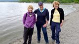 Clare Balding walks with twin sisters Pauline Walker and Fiona Rennie.(R)