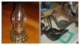 Iain MacIlleathain agus Seòras MacLeòid a' beachdachadh air seann lampaichean.(R)