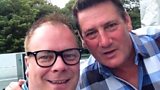 Connor chats to a man who is putting up a grandstand outside his pub for the World Cup.