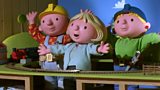 The toys want to play school, so Mr Tumble joins in and pretends to do several jobs.(R)
