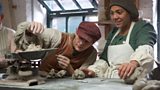 3/4The six celebrities work amid the bottle kilns of the Staffordshire potteries.(R)