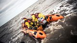 3/4The volunteers try to rescue a fishing boat that has run aground in the middle of a storm.(R)
