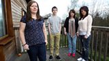 1/3Children investigate how a sheep's fleece is turned into woolly scarves.(R)