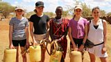 The girls' team and presenter Camille meet Kenyan wildlife and learn spear throwing.(R)