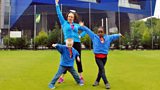 Experimenters Brandon and Ore find out about catching and throwing with some cricketers.(R)