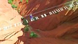 The adventurers cross a treacherous rope bridge hundreds of feet above the ground.(R)