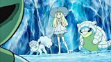 To help a group of Sandshrew, Lillie challenges a Tyranitar to a Double Battle.
