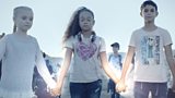 A young girl helps a boy, who follows her and they help someone else.