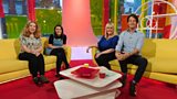 Yn anelu at ennill y jacpot o £1000, mae Daniel Sajko a Sioned Alaw Hughes ac Alwyn ac ...(A)