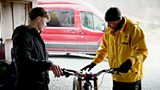 Mae Digbi yn achosi i'r beic golli pob rheolaeth ac mae'r parseli'n cwympo driphlith dr...(A)