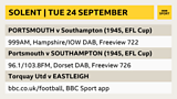 EFL Cup coverage of Portsmouth v Southampton. NOT online. Also Torquay United v Eastleigh