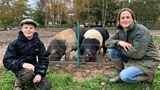 Award-winning Seb, 10, and his herd of Saddleback pigs!