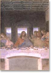 Leonardo also played tricks with the perspective in this painting. We can see the table top, even though we shouldn't be able to from where we stand. And why are so many people crowded round a table when there wouldn't be room for them all to sit?