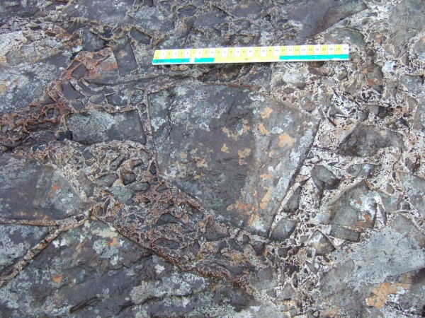 This is more like it. Rock. Hard Rock. Lots of it. Here we have an intrusion breccia. Good word that. The basalt that lies at a higher level has been intruded and generally chopped up by other igneous material. Very common in this area.