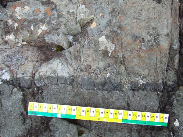 Like most of Mull there are lots of dykes crossing the rocks. This one shows very clearly what is called a chilled margin - where the hot rock comes in contact with cooler rock, it cools much faster and can develop a different appearance and a much finer grain size. Geologists get all excited about this sort of thing.