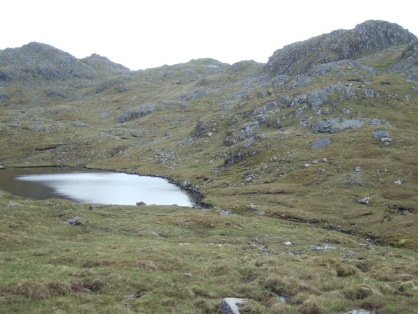 The mines are on the spur to the right above the lochan. Maybe hard to see in the pic, but there is a lot of debris from the workings on the hillside and it is easy to see