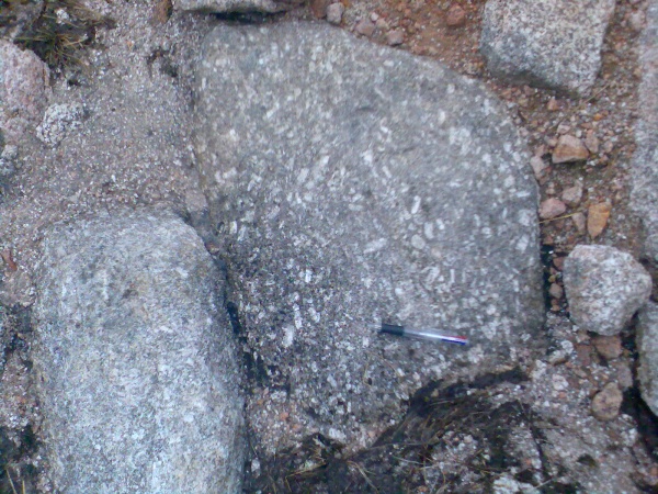 Heres an interesting rock - a fairly weathered porphyritic granite. Note the large crystals in the rock, like white laths. Many igneous rocks have larger crystals in a relatively finer groundmas - these are "porphyritic". Now this stuff in the pic can be seen at several places along the path, but it is not in situ. I have never found the actual rock itself, but the unweathered stuff must look quite neat. Weathering of granites causes the feldspar minerals to break down into kaolin - which is what the whitish colour is.