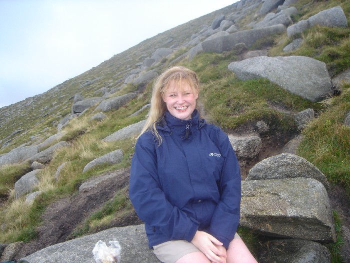 Met Julie ant Sylv at the summit. It was very windy and the cloud had the cheek to come down and spoil the view. Typical! It took vitrually the same time from both routes. The Corrie route is much shorter but steeper, the Brodick route is definitely easier.