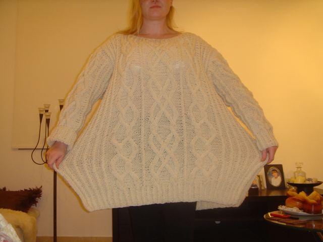 The club fell apart because we started to forget our knitting and going to each others for dinner and drinks and almost all the members are now engaged or left the island or both. I only had a sleeve left to do so I finished it off in my sick bed and eh voa la! It's big enough to house half the island. I'm gubbed! It was a really complicated cable and I'm gonna have to rip it all out... Boo Hoo!