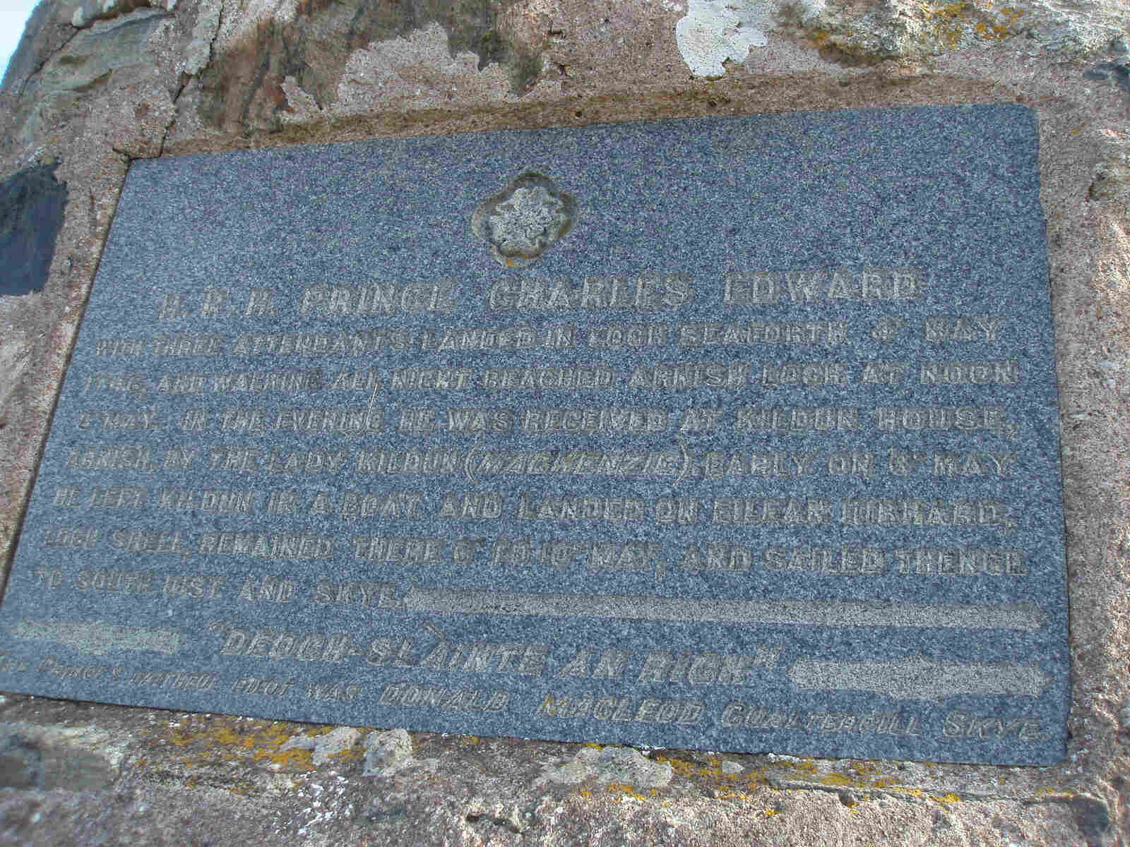 The inscription reads: HRH Prince Charles Edward with three attendants landed in Loch Seaforth 4 May 1746 and walking all night reached Arnish Loch at noon 5 May. In the evening he was received at Kildun House, Arnish, by the Lady Kildun (MacKenzie). Early in 6 May, he left Kildun in a boat and landed in Eilean Iubhard (Loch Shell) and remained there until 10 May and sailed thence to South Uist and Skye. [inscription obliterated] "Deoch Slainte an Righ" [inscription obliterated].