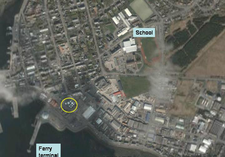 Just to show you the situation at Stornoway. The tanks are within the yellow circle; I have pointed out the school (Nicolson Institute) and the ferry terminal for reference.