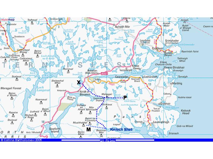 Kinlochshell is marked on the map. P denotes the approximate position of the Pairc windfarm, M the approximate position of the Eishken project and X, just southwest of Balallan, is the link-up with the existing high-voltage network in the island. Very few people indeed will be inconvenienced by the cabling if done this way. I think it's the grand total of two houses - one near Kinloch Seaforth, the other half a mile further west at Sideabhal.