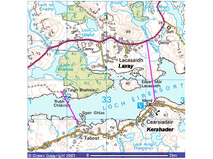 The crossing would cut 10 miles off the journey from Stornoway to South Lochs. Two locations are being considered, both starting from the village of Laxay. One would go from the Bhaltos area, to the east of Laxay to Habost in South Lochs. The length of this crossing is 800 metres / ½ mile; the second location would cross from Ravenspoint in Kershader to the Keose side of Laxay, which is 500 metres / ¼ mile. If the Eishken windfarm is granted planning permission by the Scottish Executive, rock, quarried from Eishken would be used in the construction of the crossing.
