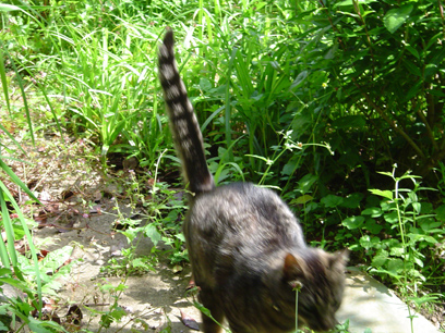 He's stalking his grounds against invasion from a Big GingeryWhite thing and a little GingeryWhite thing. BGWT knows when to back down, but LGWT just wants to play - which isn't helping MC trying to act all macho. Mind you MC didn't look too macho when he was up the arbour looking down on both GWTs.
