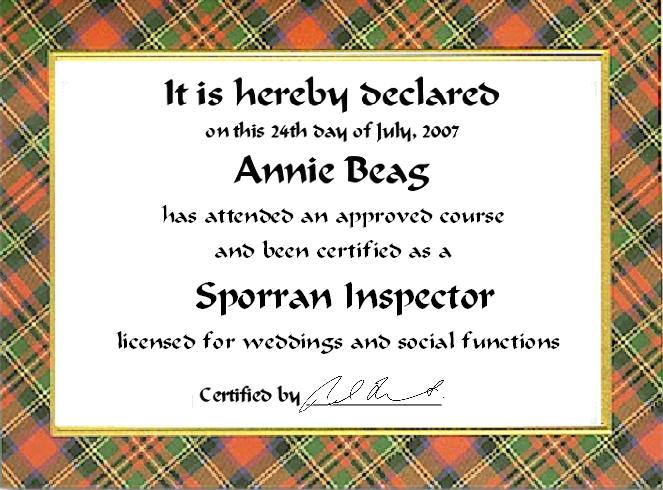Well I've been busy researching kilts and sporrans and am proud to tell you that I'm now a fully certified Sporran Inspector. Here's a copy of my certificate.