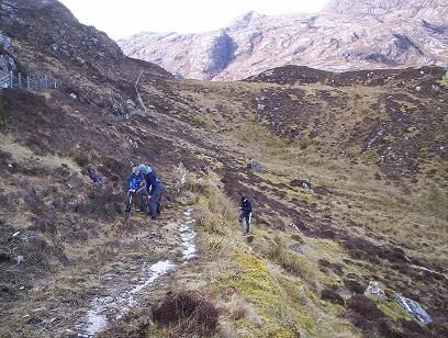 In the spring we did quite a bit of work on the track from the village up to the Reinigeadal/Urgha track. It seems according to map evidence to be later in construction than the Reinigeadal track - about the early 1900's. It was apparently maintained by the local authority until about the early 1960's. The main need at the outset is to get the blocked drains and culverts running again to let the track dry out. Much of the drainage needed has now been done and there is already a great improvement to be seen.