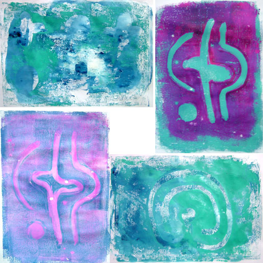 I browsed through some books and magazines, made tea ~ always a good diversion, then the light bulb moment ~ I had printing ink and sketch paper so lets have a play with some mono prints, still working with the rock art design symbols, here is a photoshop collage of a few,