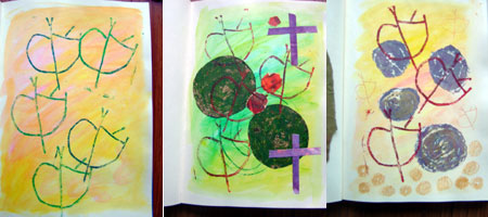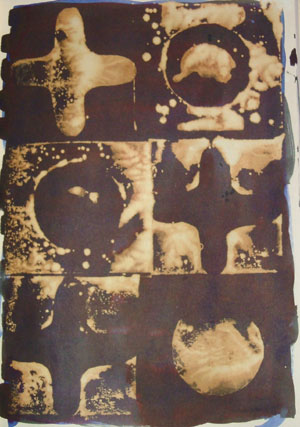 I’m looking forward to going to Jane’s Blue pig studio tomorrow (Wednesday) and plan to use her press and do some collograph prints, I’m taking one plate I had made a few years ago but have not had the opportunity to use and I have just made a new one using one of the rock art carvings as a design, Jane has asked me to show her the discharge method with ink and bleach on paper so it should be a productive day this is a page in my sketch book using this method, I have really grown to like the cup and cross shapes and I have played with them on several pages I am hoping to find some time to do some on fabric this weekend,