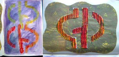 And this is one of my favourite shapes, I have made it dumpier than the original as that was the size of the piece of corrugated card that I had, it didn’t print well so the prints have been worked into with other stuff and I cut up the block and put the shapes on a painted background, I like the corded effect,