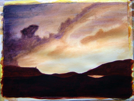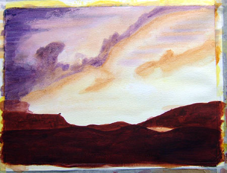 I am still pursuing bleeding acrylic paints, this time I used a tonal sketch I did a few years ago, it was done on the sand dunes at Lionacleit, Benbecula, looking north across Benbecula towards North Uist, the time of year was September so I used the greens, browns and shades between that are on the island crofts then, the painting as it was when we finished at the meeting,